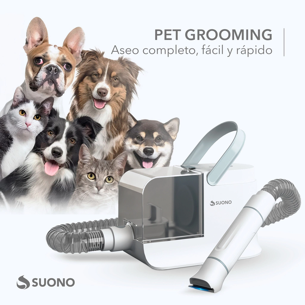 El Pet Grooming Suono es un sistema todo en uno diseñado para mantener a tus mascotas limpias, cuidadas y felices, sin ensuciar tu hogar. Con 350W de potencia, múltiples accesorios y un sistema de succión ajustable, este equipo te permite cepillar, cortar, aspirar y pulir el pelo de tu mascota con resultados profesionales desde la comodidad de tu casa.
